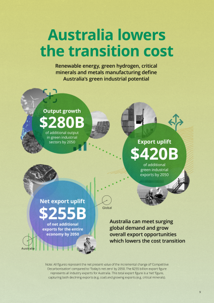“Increases in productivity and innovation across connected supply chains and emerging technological processes grows Australia’s green industrial export opportunities by $420bn by 2050.”